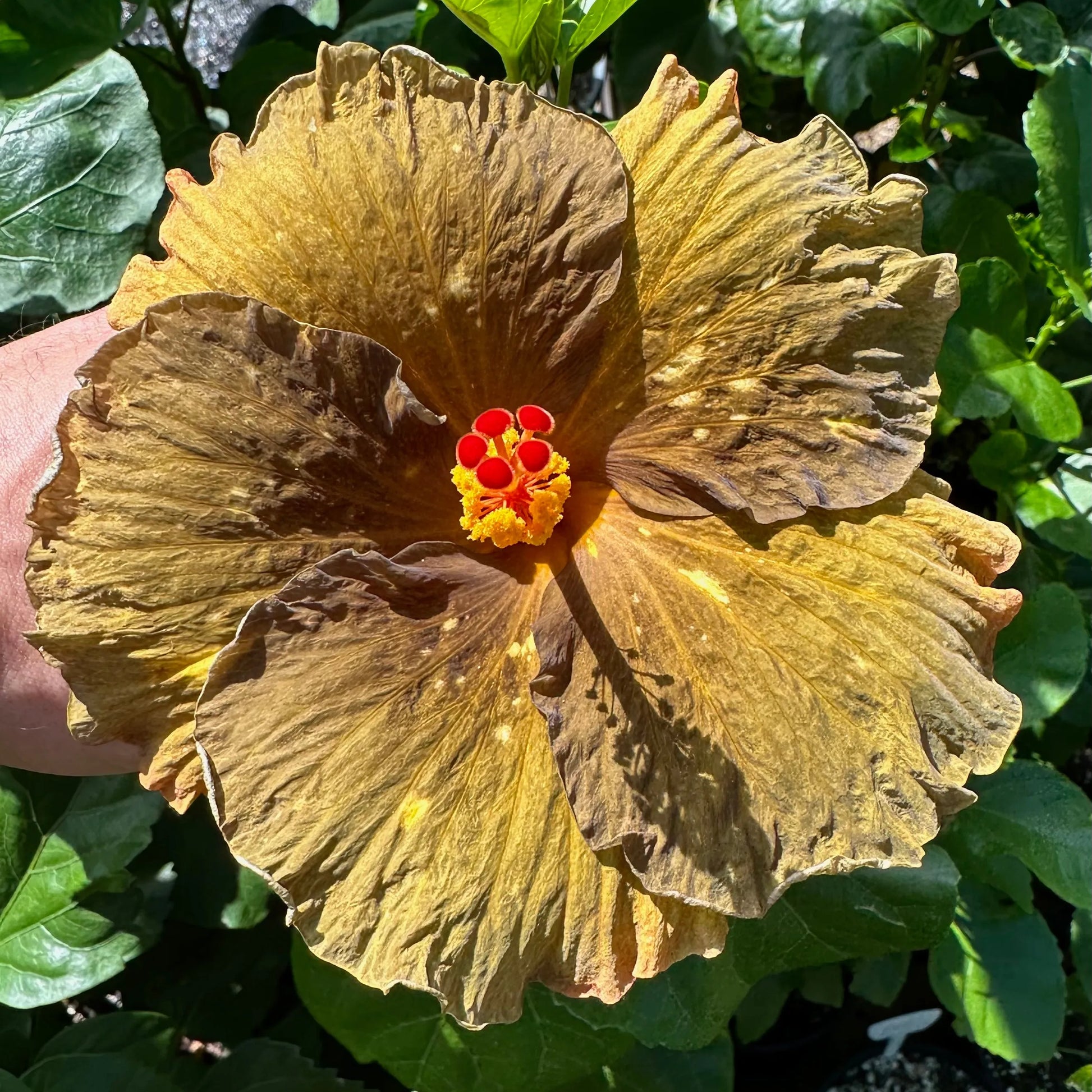 Bewitched Bronze, a captivating hibiscus, dons a bewitching bronze hue resembling molten metal, adorned with shimmering yellow spots like sparks. This enchanting cultivar transforms the garden with spellbinding allure, capturing the mystique of magical metamorphosis. The mesmerizing display of bronzed petals, surrounded by lush green foliage, exudes regal elegance. Bewitched Bronze, flourishing as a majestic hibiscus shrub or ornamental tree, brings an enigmatic touch of magic to the garden's landscape.