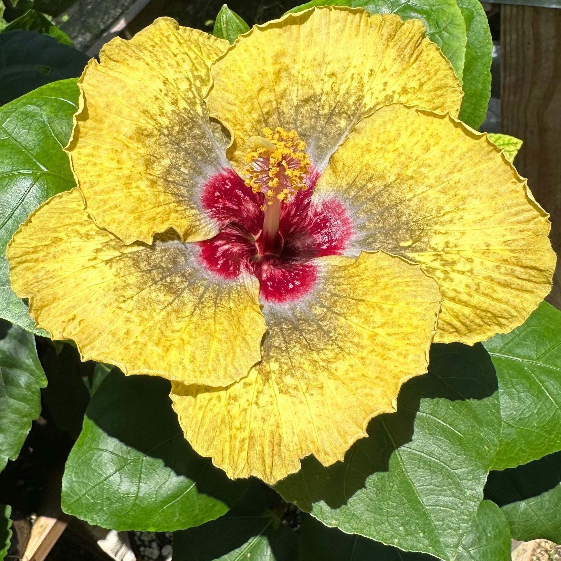 Sunbeam Sorcery, a dazzling hibiscus, commands attention with its vibrant golden hue and captivating red center. Delicate bronze shading around the red heart adds enchantment, creating a spectacle reminiscent of magical sorcery. Surrounded by lush green foliage, this radiant cultivar flourishes as a hibiscus shrub or ornamental tree, illuminating the garden with its golden luminosity—a natural spell of radiant beauty in nature's own showcase.