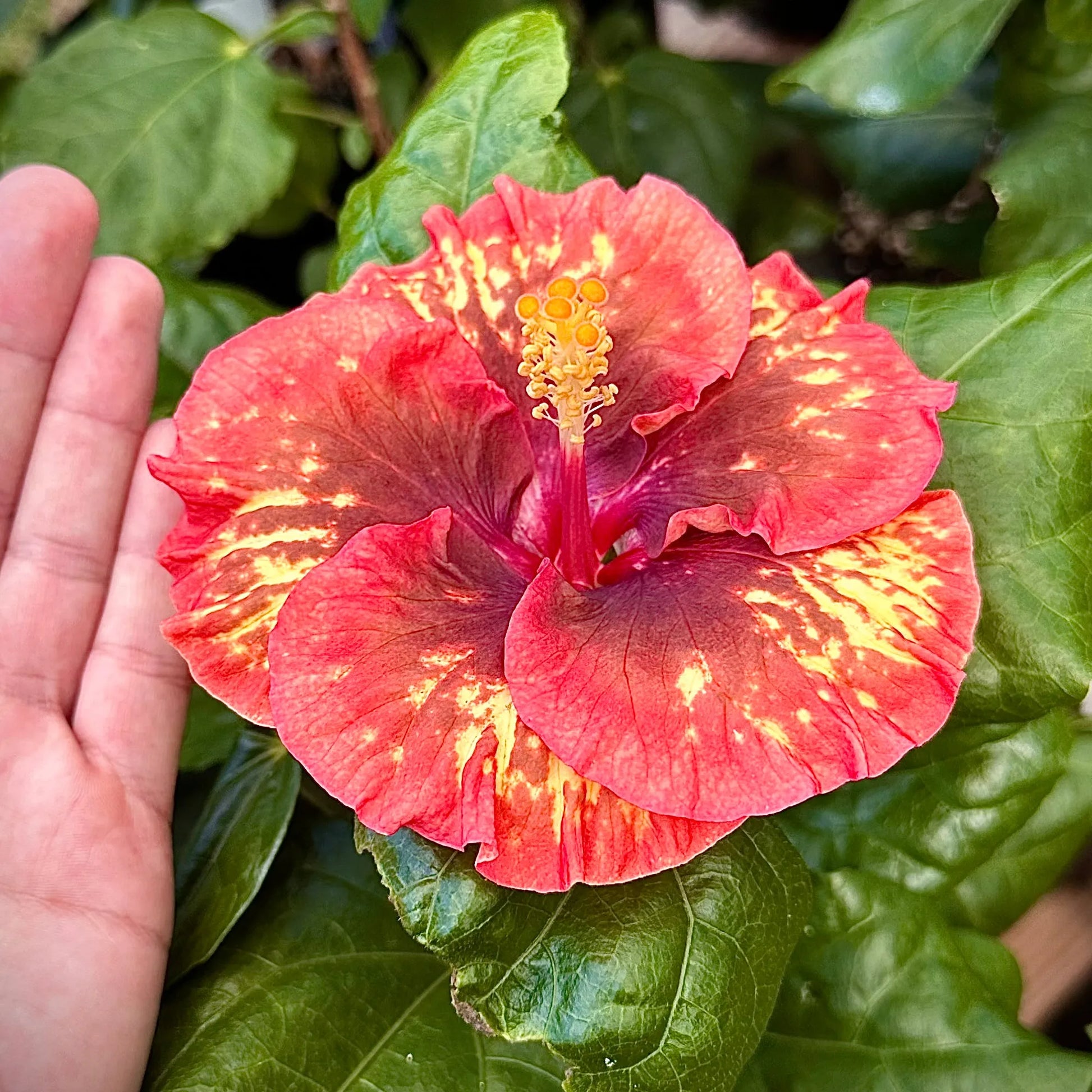 Stellar Fusion, a mesmerizing hibiscus, orchestrates a captivating color dance from dawn to dusk. Starting as a vibrant red flower with yellow streaks, it transforms into a golden yellow masterpiece with silver markings, creating a celestial spectacle. In the morning, radiant red petals capture dawn's essence, transitioning to golden yellow with silver markings in the afternoon, culminating in a dramatic center evolution from almost black to red and bronze, adding depth to this daily celestial performance.