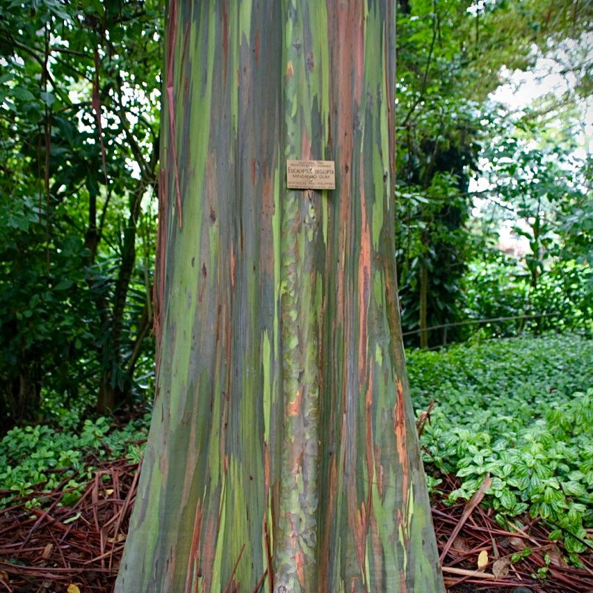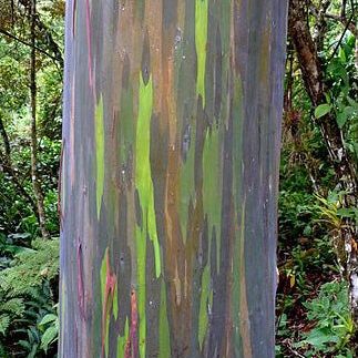 The Rainbow Eucalyptus is renowned for its unique, multi-hued bark. Shades of green, blue, purple, orange, and maroon peel away in strips to reveal a bright, almost fluorescent green layer beneath, creating a naturally occurring rainbow effect.