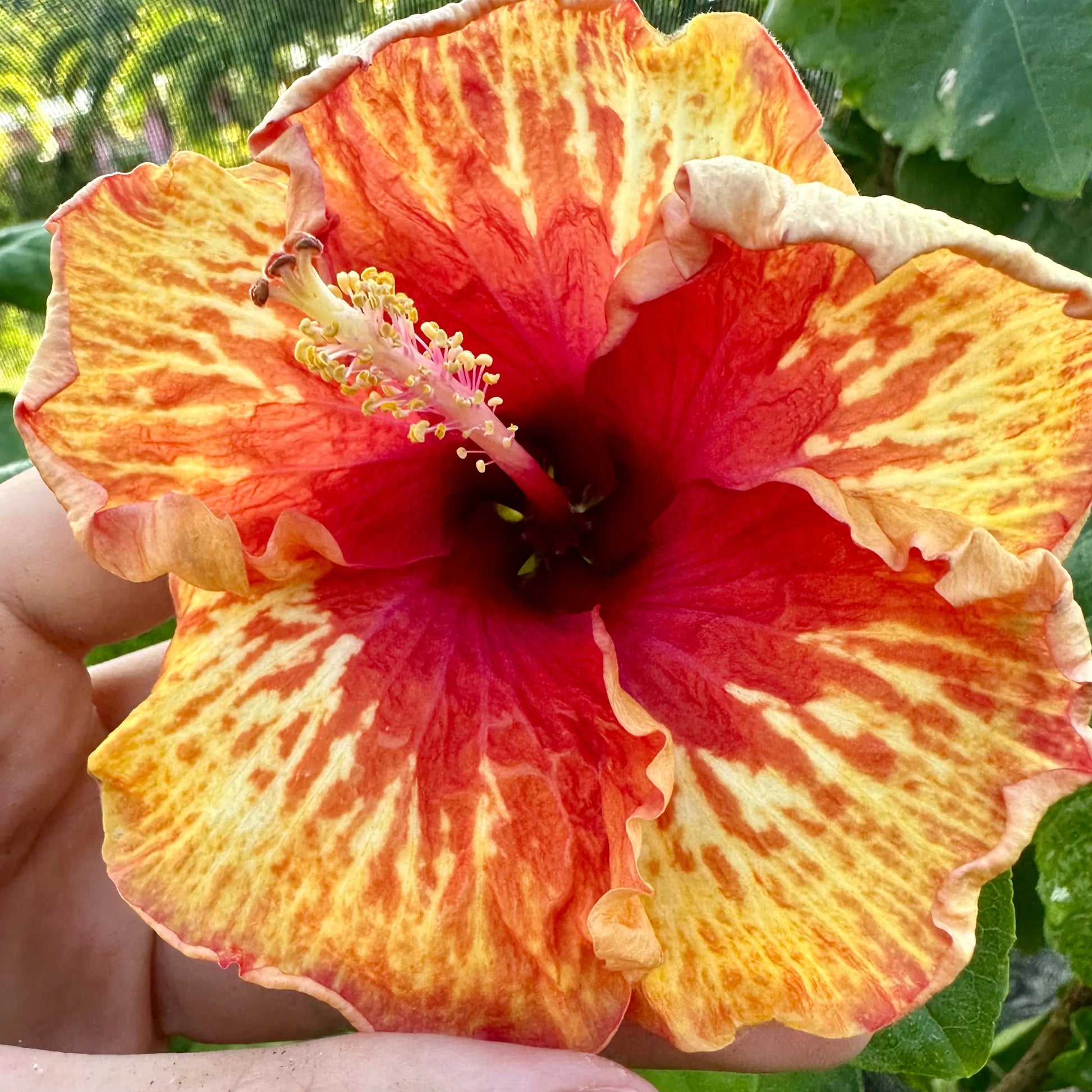 Bennu's Glowing Blaze, a vibrant symbol of fiery brilliance, captivates the garden. This red hibiscus, adorned with captivating yellow streaks, ignites a red tapestry that radiates warmth and vibrancy. Luminous yellow streaks, resembling sparks of an eternal flame, dance across the petals, infusing Bennu's Glowing Blaze with celestial energy—a fiery spectacle echoing the mythical nature of the Bennu bird.
