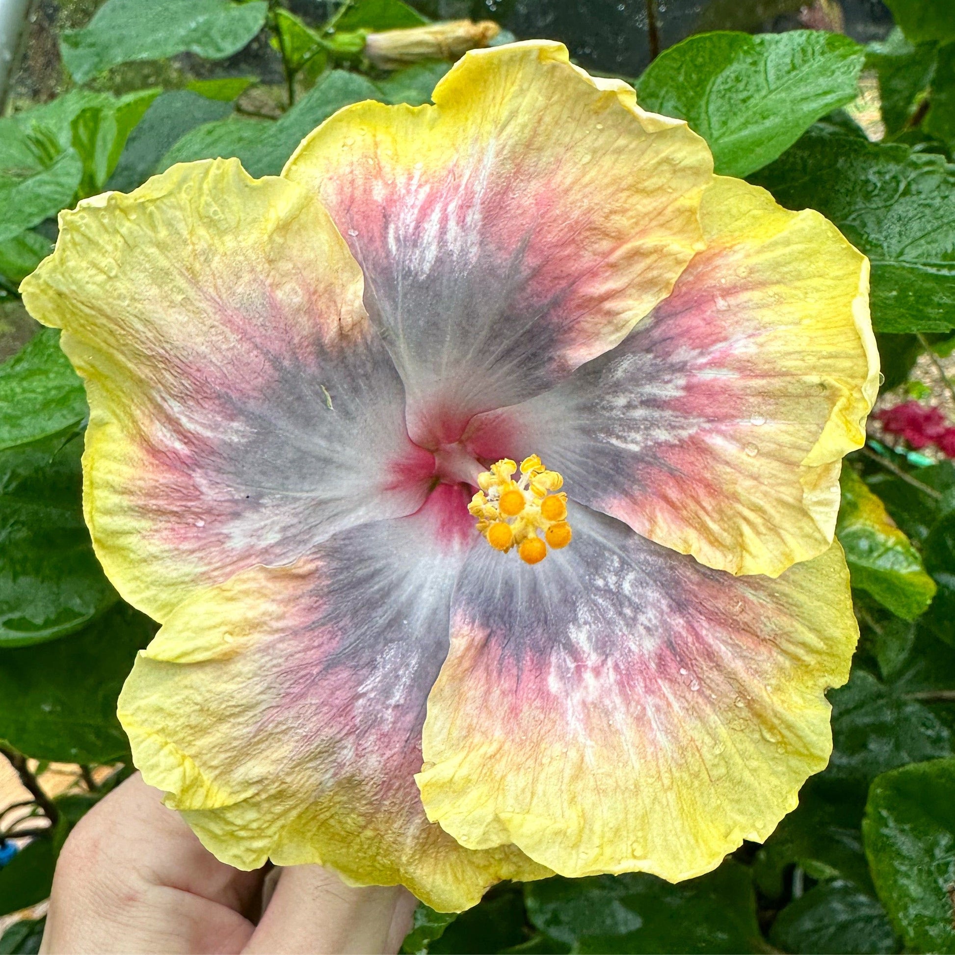 Canary Diamond illuminates the garden with its resplendent yellow petals transitioning to a delicate pink blush at the base, surrounding a soft charcoal center. This hibiscus resembles a precious gemstone, with a bloom that reflects the light and color of a rare canary diamond.