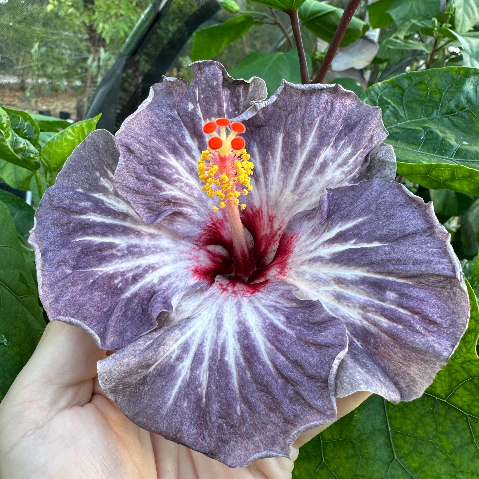 The Nightshade Nebula hibiscus is a botanical homage to the dark vastness of space, with its deep purple petals that swirl around a vibrant, star-like crimson center. This extraordinary cultivar brings the intrigue of the universe's dark wonders to your garden.