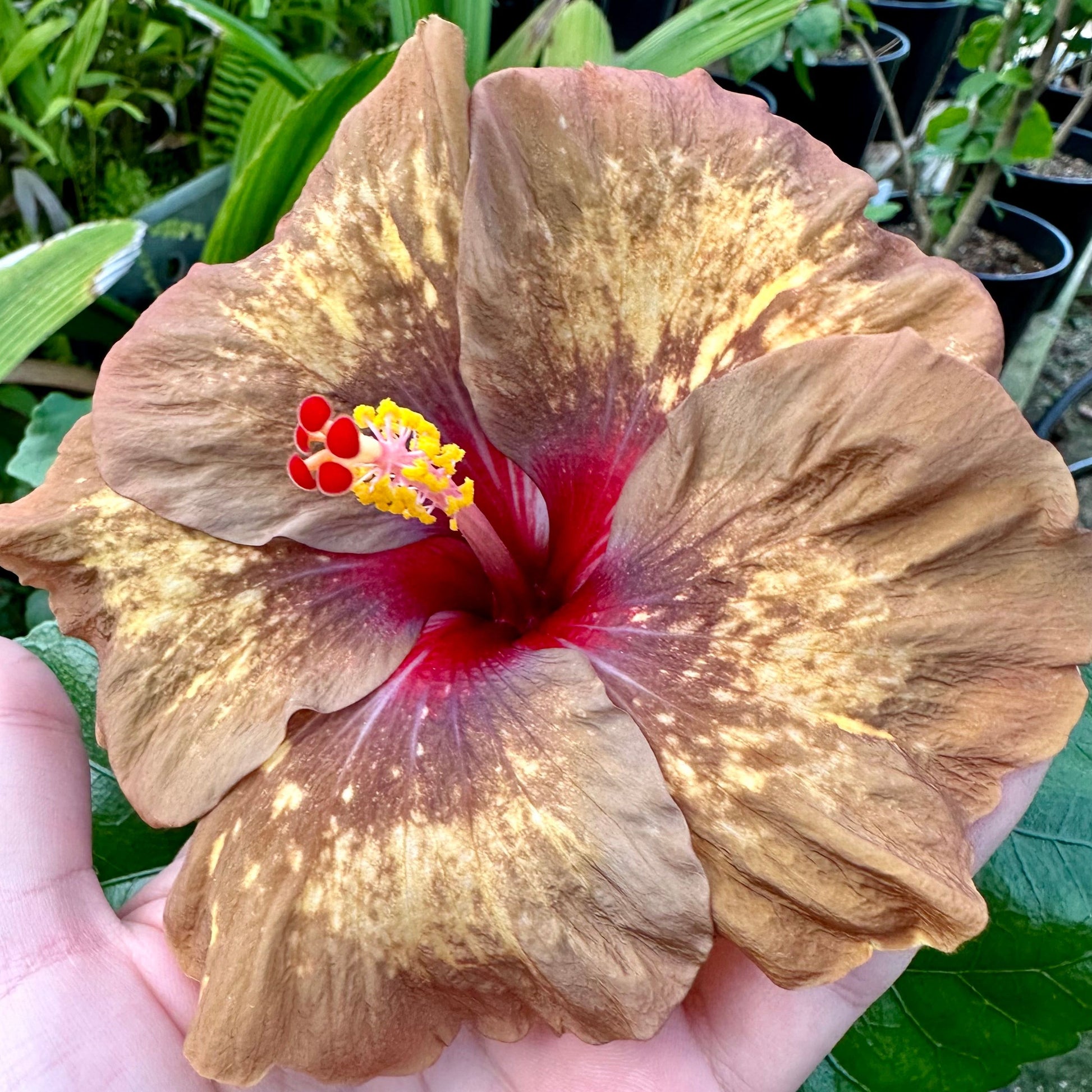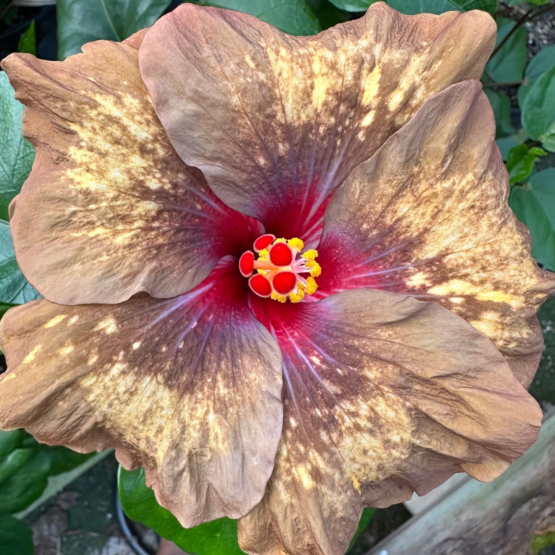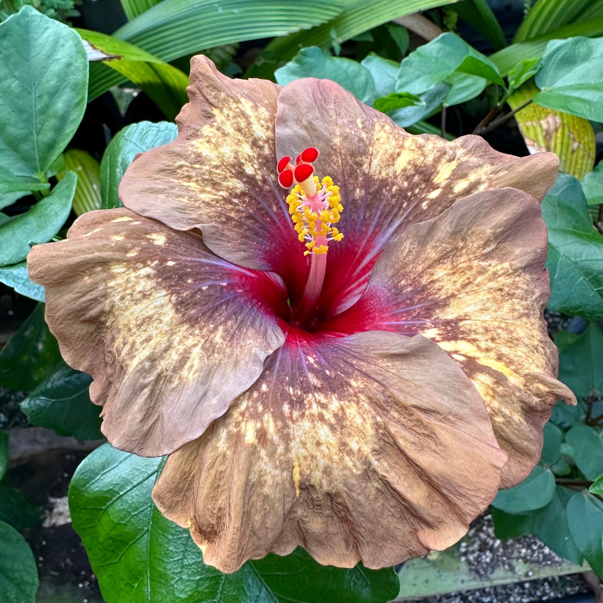 Rainforest Relic is a hibiscus that evokes the timeless beauty of a primordial forest, with its petals displaying a tapestry of earthy browns and rich crimson, flecked with golden speckles. This bloom captures the essence of an age-old treasure, long hidden within the lush greenery of a dense rainforest.