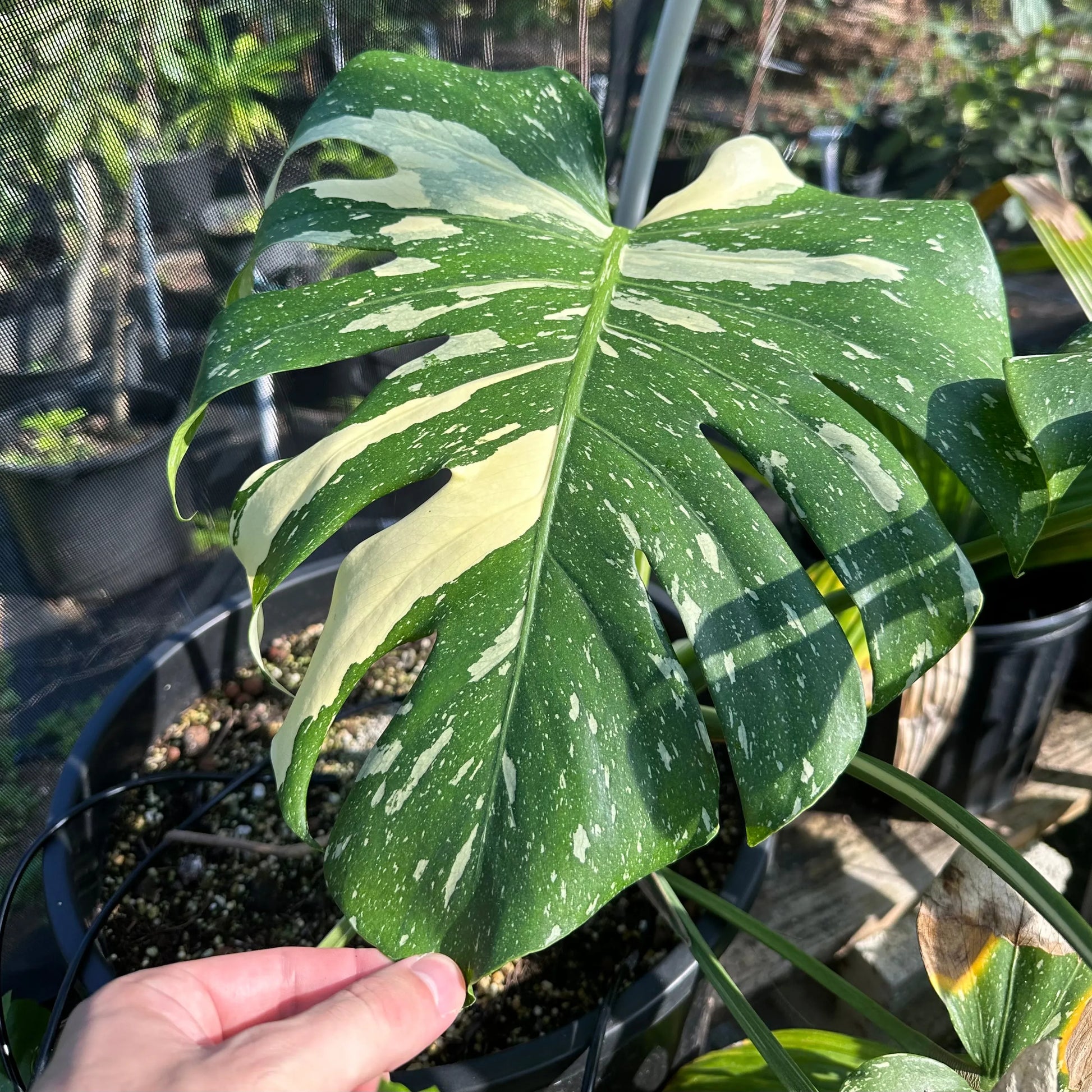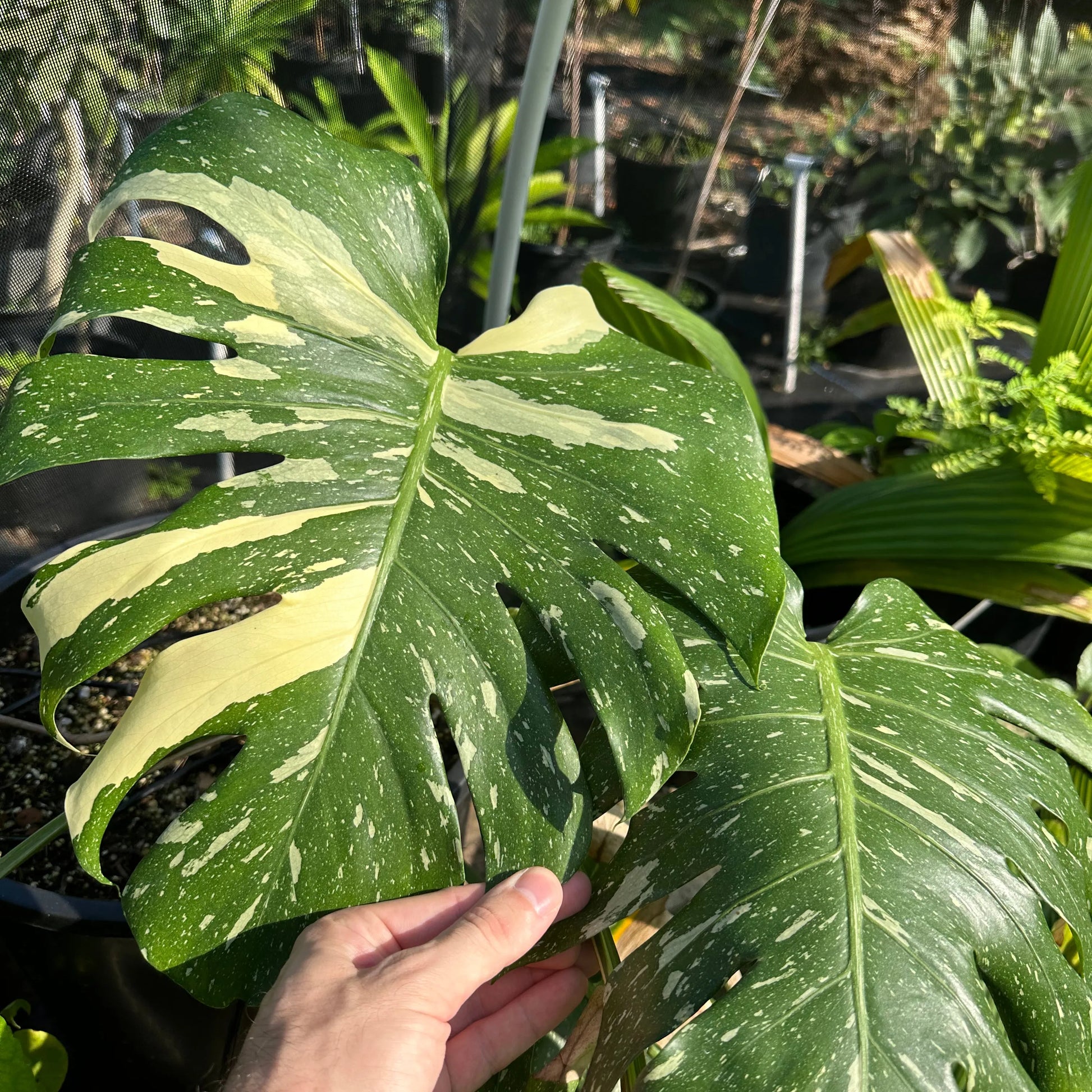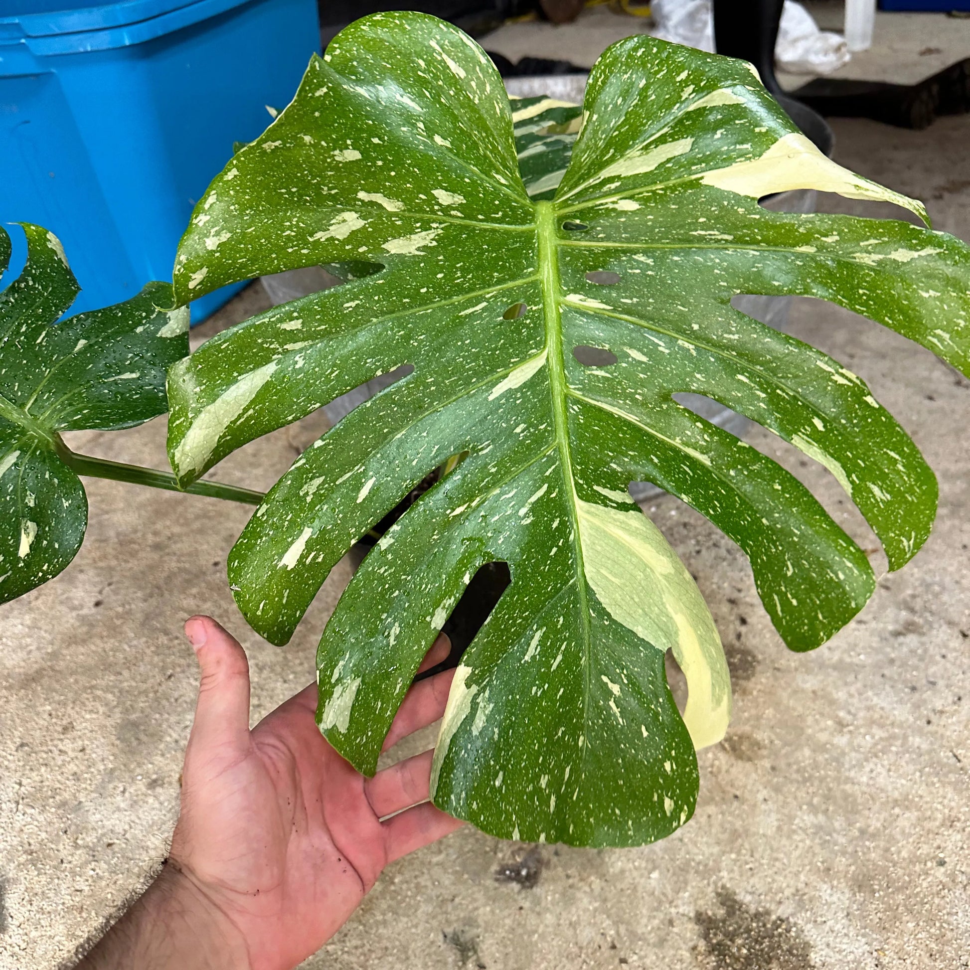 Each leaf of the 'Thai Constellation' is like a unique galaxy with patterns that are a creamy white or yellow, contrasting with the deep green of the leaf. The variegation occurs randomly, making every leaf a work of art.